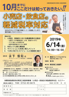当所では、以下のとおり、小売店・飲食店向けに、主に、軽減税率導入に関する準備について、具体的な対応方法をお伝えするセミナーを開催することといたしましたのでお知らせいたします。